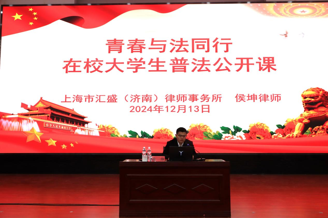为进一步增强在校大学生的法治观念,提升法律素养,12月13日,我校在图书馆西报告厅开展了“青春与法同行”在校大学生普法公开课活动,活动邀请上海市汇盛(济南)律师事务所律师侯坤担任主讲,2023、2024级同学参加。