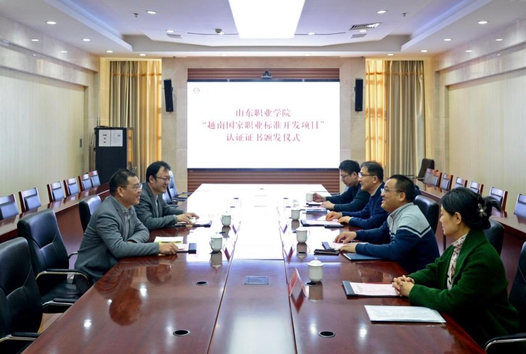 仪式上,合作机构向学校正式转递了由越南劳动荣军社会部颁发的越南国家职业标准开发(铁道机车操作与维护技术员3级、铁路工程技术员3级)认证证书,并移交相关项目资料。随后与会人员就项目进展情况进行了深入交流,并探讨了学校与越南及东盟其他院校开展进一步合作的具体实施方案。