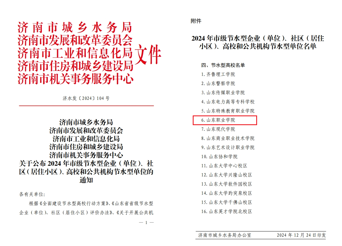 近日,由济南市城乡水务局、市发展和改革委员会、市工业和信息化局、市住房和城乡建设局及市机关事务服务中心共同组织的2024年度节水型单位评选结果公布。我校被正式授予“济南市节水型高校”的荣誉称号。
