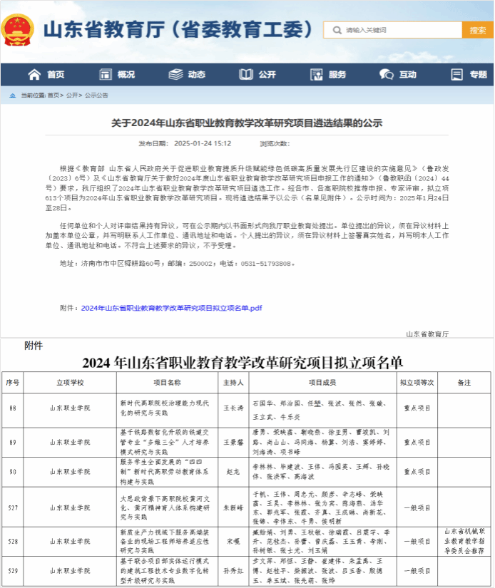 近日,山东省教育厅公布了2024年山东省职业教育教学改革研究项目遴选结果,我校共有6个项目立项。其中,重点项目3项,一般项目3项,重点项目立项数量创新高。