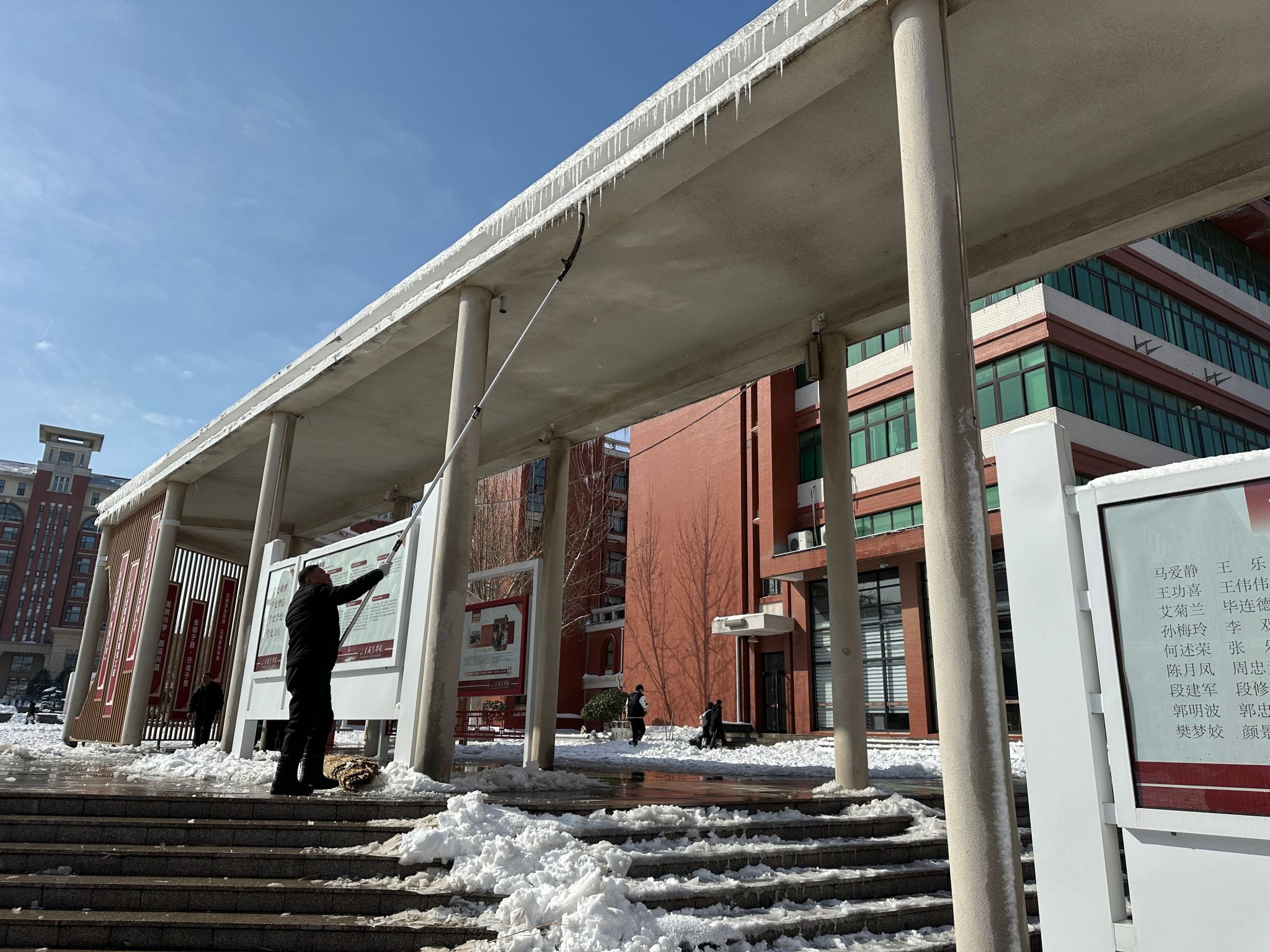 今日一早,校园里便出现了许多忙碌的身影,校领导,各职能处室、各书院、各学院、青年志愿者等纷纷行动,大家手持铁锹,顶着寒风,铲除主干道、台阶上的积雪、冰层,经过数小时的奋战,通往各教学楼的干净、平整、安全的道路逐渐显现,确保了师生上下课顺畅无阻。除此之外,学校还在台阶上铺设了草毡子,敲落了廊顶上的冰棱,消除安全隐患。