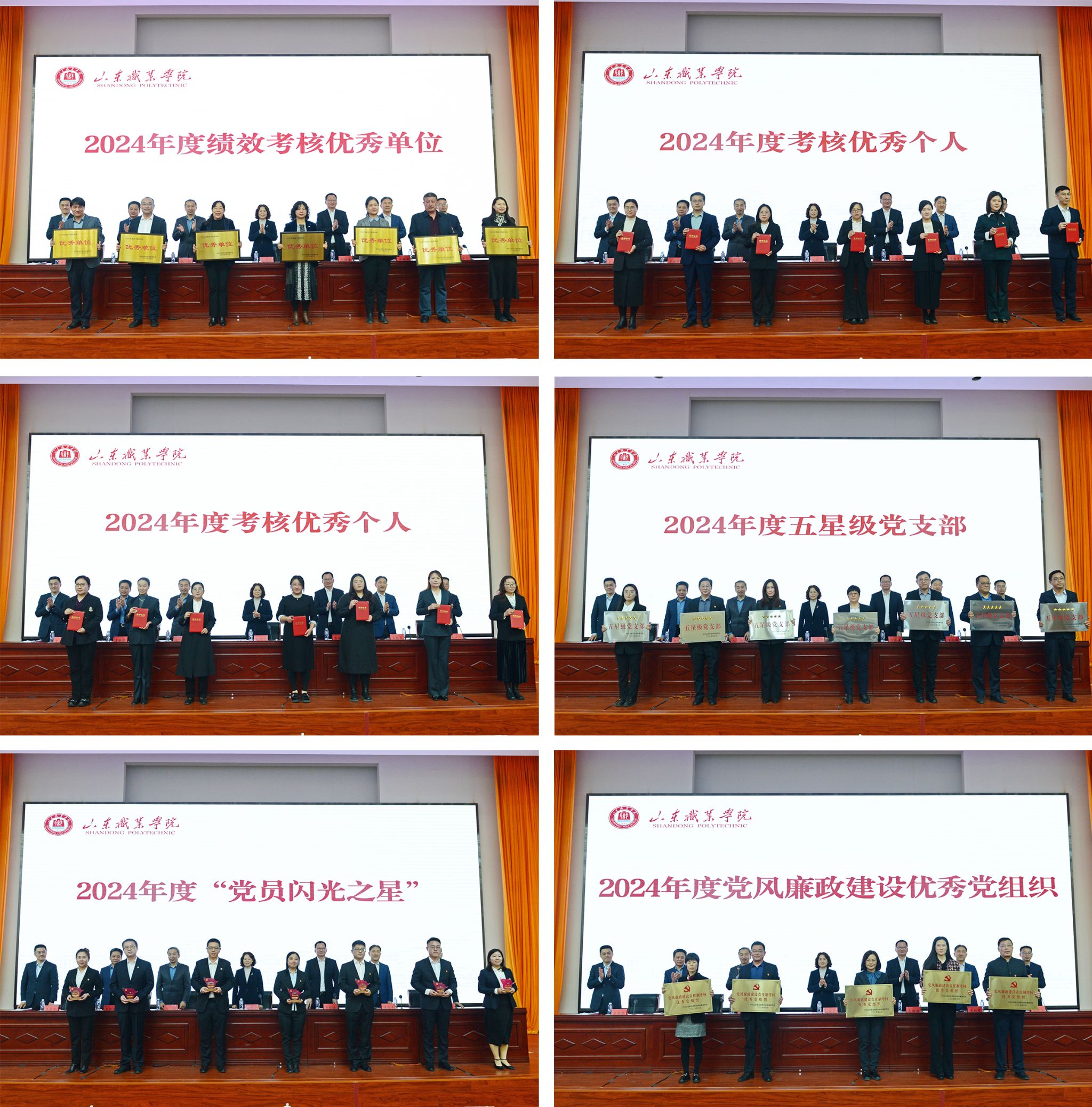 副院长王绍军、李新华、张少飞,纪委书记朱新峰分别宣读了《关于表彰2024年度绩效考核优秀单位的决定》《关于表彰2024年度考核优秀个人的决定》《关于表彰2024年度五星级党支部的决定》《关于表彰2024年度“党员闪光之星”的决定》《关于表彰2024年度党风廉政建设优秀党组织的决定》。校领导为获表彰的集体和个人代表颁发荣誉奖牌、证书。