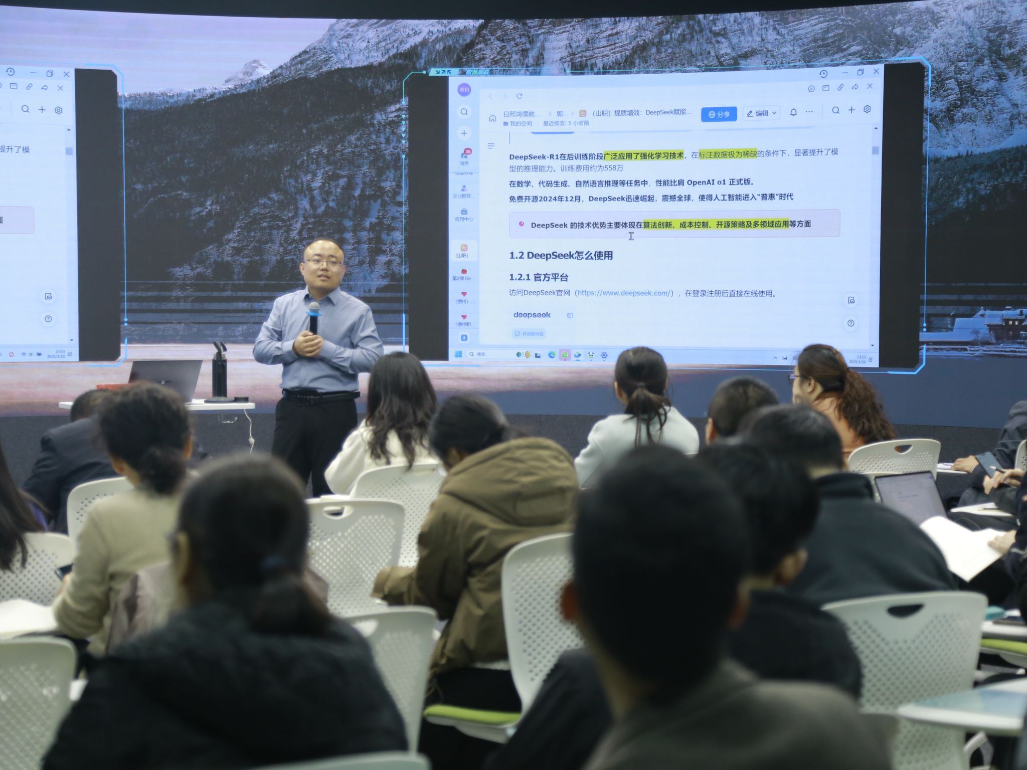 郭顺利从“AI 技术与教研融合”“大模型赋能教学管理”“科研选题与写作创新”三大维度展开,系统呈现了AI大模型在教学管理、科研选题、文献综述、论文写作等环节的创新应用,重点阐释了DeepSeek在PPT制作、思维导图生成、数据分析、论文润色等场景中的实操路径。讲座中,郭教授还通过“课堂随机点名小程序生成”“课程智能体制作”等案例,演示了如何借助AI工具突破传统教研瓶颈,实现提质增效。现场教师专注聆听,认真记录,大家纷纷表示,“本场讲座案例翔实,方法实用,为数字化教研提供了新思路”。