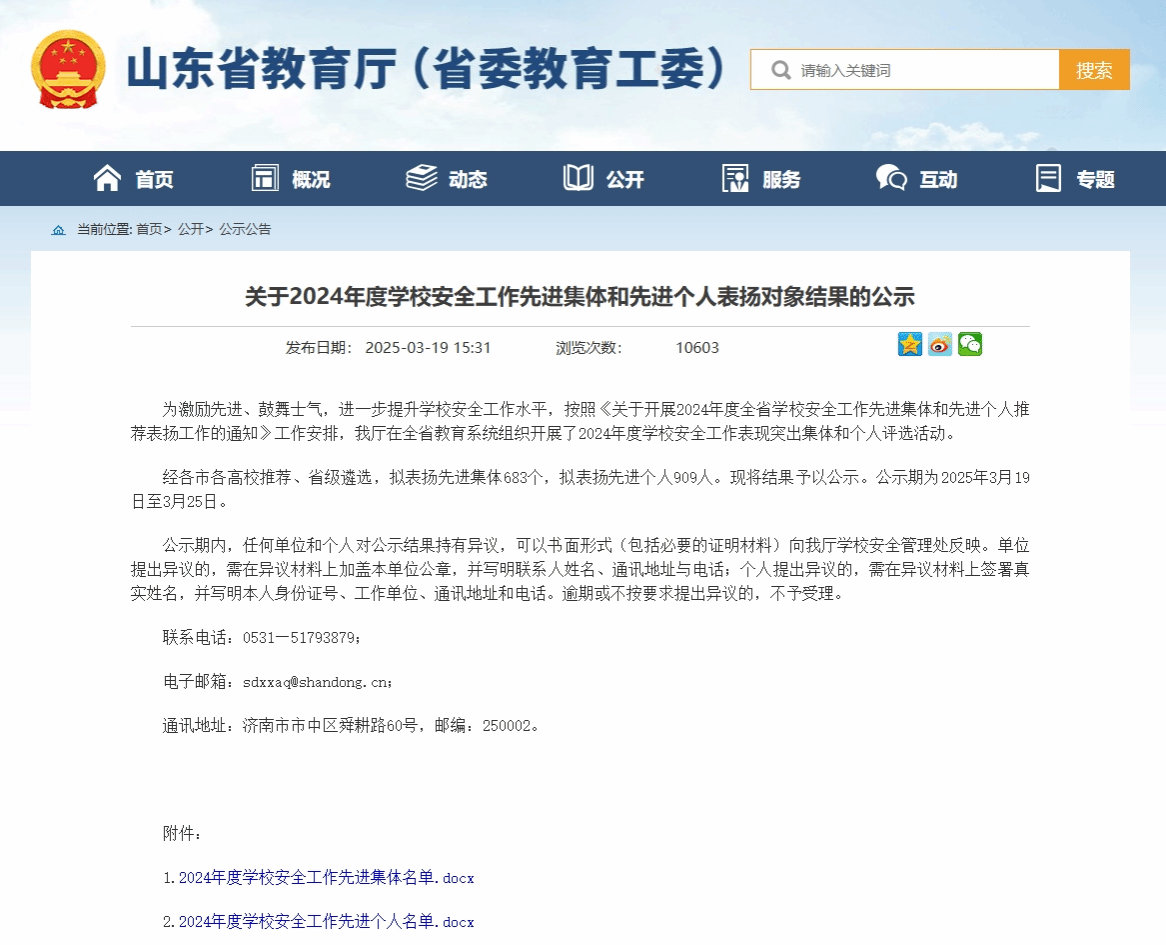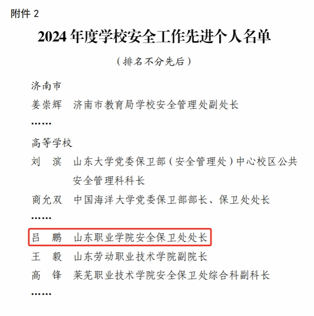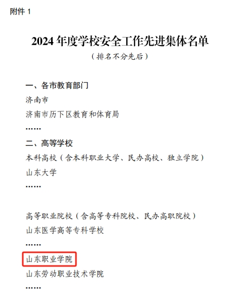 3月19日,山东省教育厅发布了《关于2024年度学校安全工作先进集体和先进个人表扬对象结果的公示》,我校获评2024年度学校安全工作先进集体,安全保卫处处长吕鹏被评为2024年度学校安全工作先进个人。