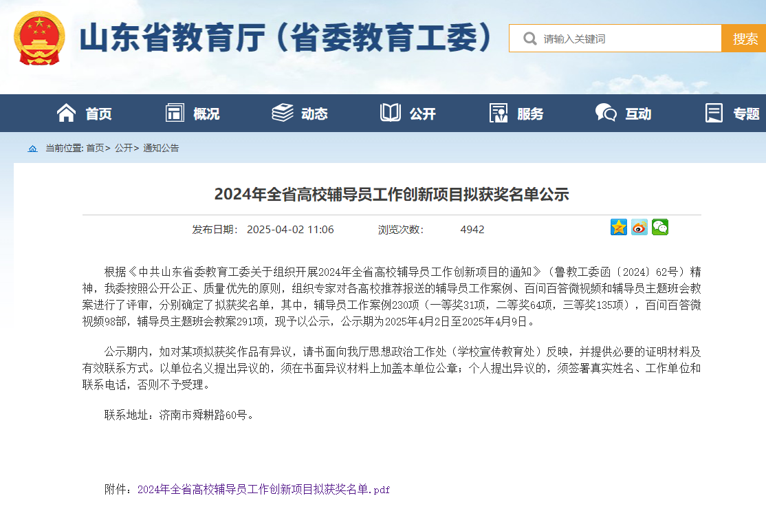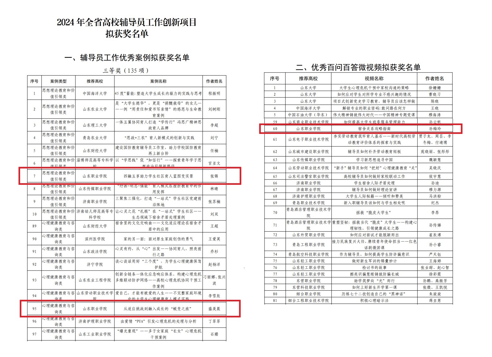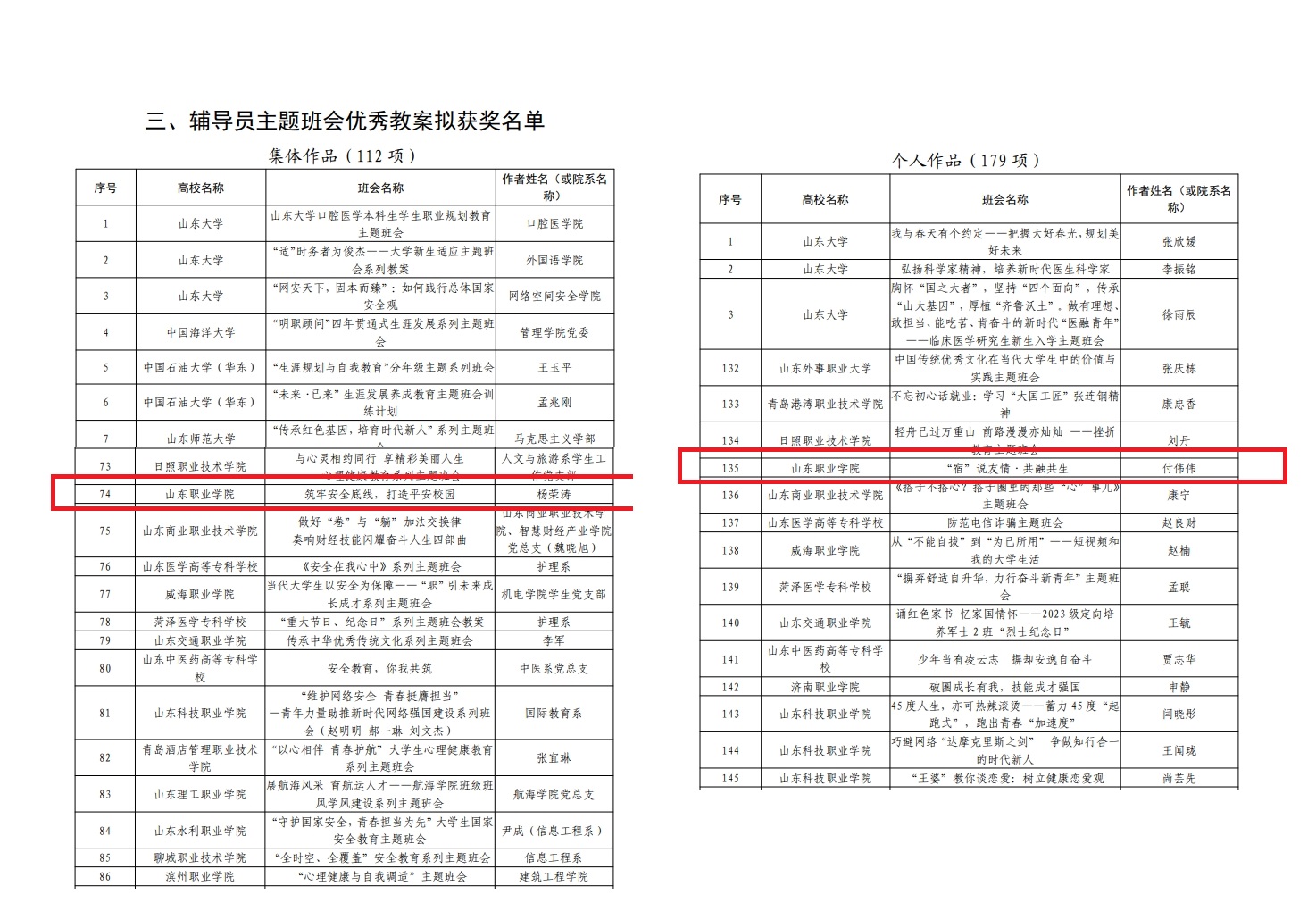 近日,山东省教育厅公布了2024年全省高校辅导员工作创新项目拟获奖名单。我校获得辅导员工作优秀案例三等奖2项,优秀百问百答微视频1项,辅导员主题班会优秀教案2项。