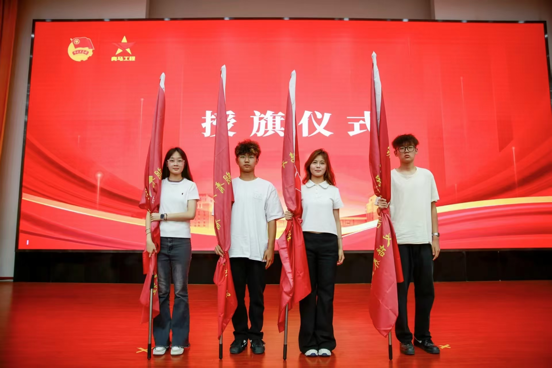 授旗仪式上,本期培训班四个班次班长依次接过青马旗帜,团学骨干进修班优秀学员代表上台领取结业证书。