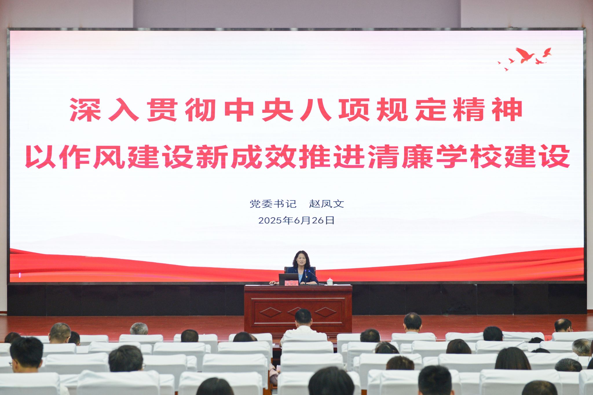 赵凤文以“深入贯彻中央八项规定精神 以作风建设新成效推进清廉学校建设”为题,结合自身学习,联系学校实际,围绕“深溯源、明要义,系统把握中央八项规定精神的核心内涵与实践要求”“悟意义、强担当,深入领会贯彻中央八项规定精神的政治价值与时代使命”“剖案例、明底线,深入剖析违反中央八项规定精神的具体表现与典型问题”“对标尺、促落实,扎实推进中央八项规定精神在清廉学校中的贯彻执行”四个方面作了系统讲解和深入阐释。