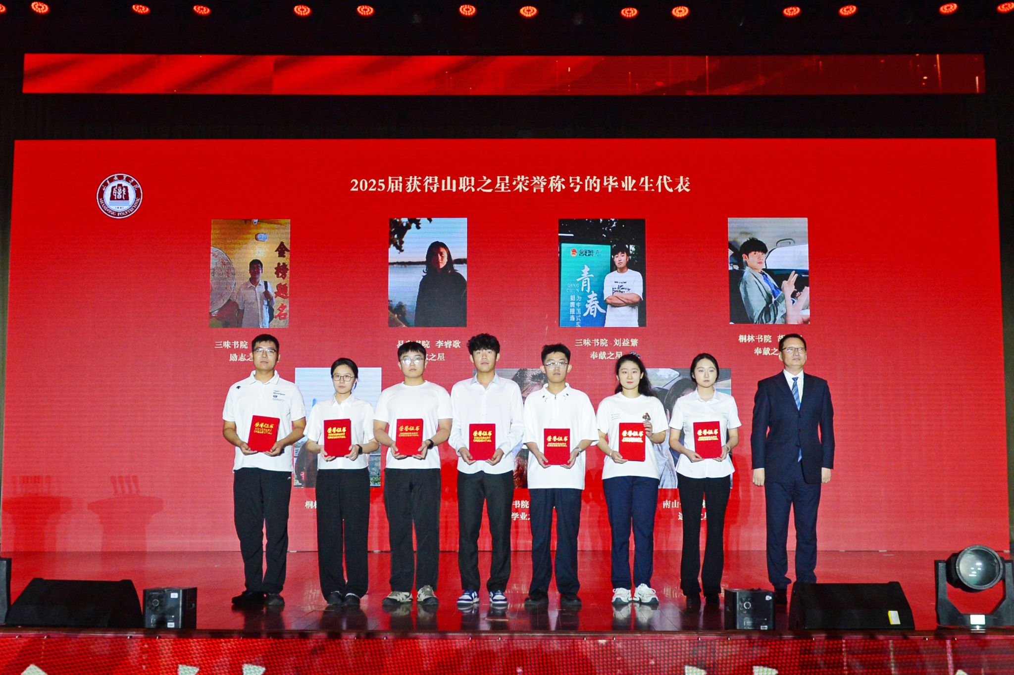党委书记赵凤文为优秀毕业生代表颁发毕业证书,院长郭培谦为“山职之星”荣誉称号获得者颁发证书,副院长李新华、张少飞分别为获得“表现突出奖”及国家、省市奖学金毕业生代表颁发证书。