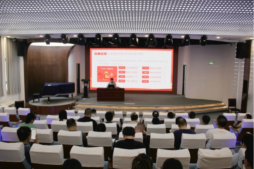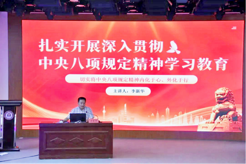 李新华深入讲解了“中央八项规定何以深刻改变中国”的历史性成就,系统梳理了关于中央八项规定精神重要论述的核心要义,并对新形势下如何持续开展深入贯彻中央八项规定精神学习教育进行了讲解。他指出,开展深入贯彻中央八项规定精神学习教育是党中央立足新时代新征程作出的重大决策部署,成为新时代改变政治生态和社会面貌的标志性举措,推动了百年大党通过自我革命焕发生机。他强调,中央八项规定从改进调查研究到厉行勤俭节约等八个方面,为党的作风建设立下铁规,明确了新形势下作风建设抓什么、怎么抓的问题。他要求党员干部要以中央八项规定精神为指引,持续深化作风建设,不断提升工作效能,为推进学校高质量发展贡献力量。