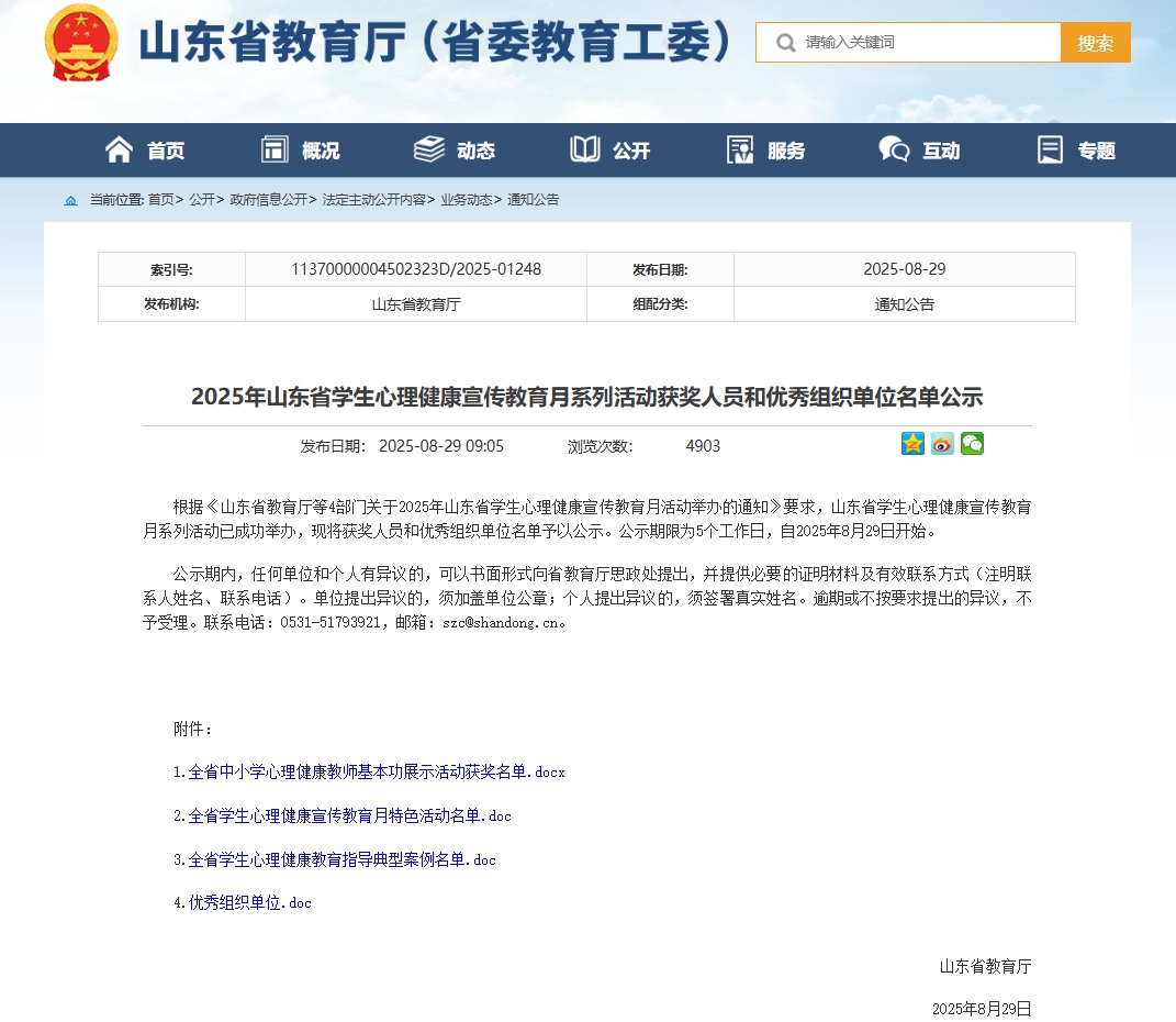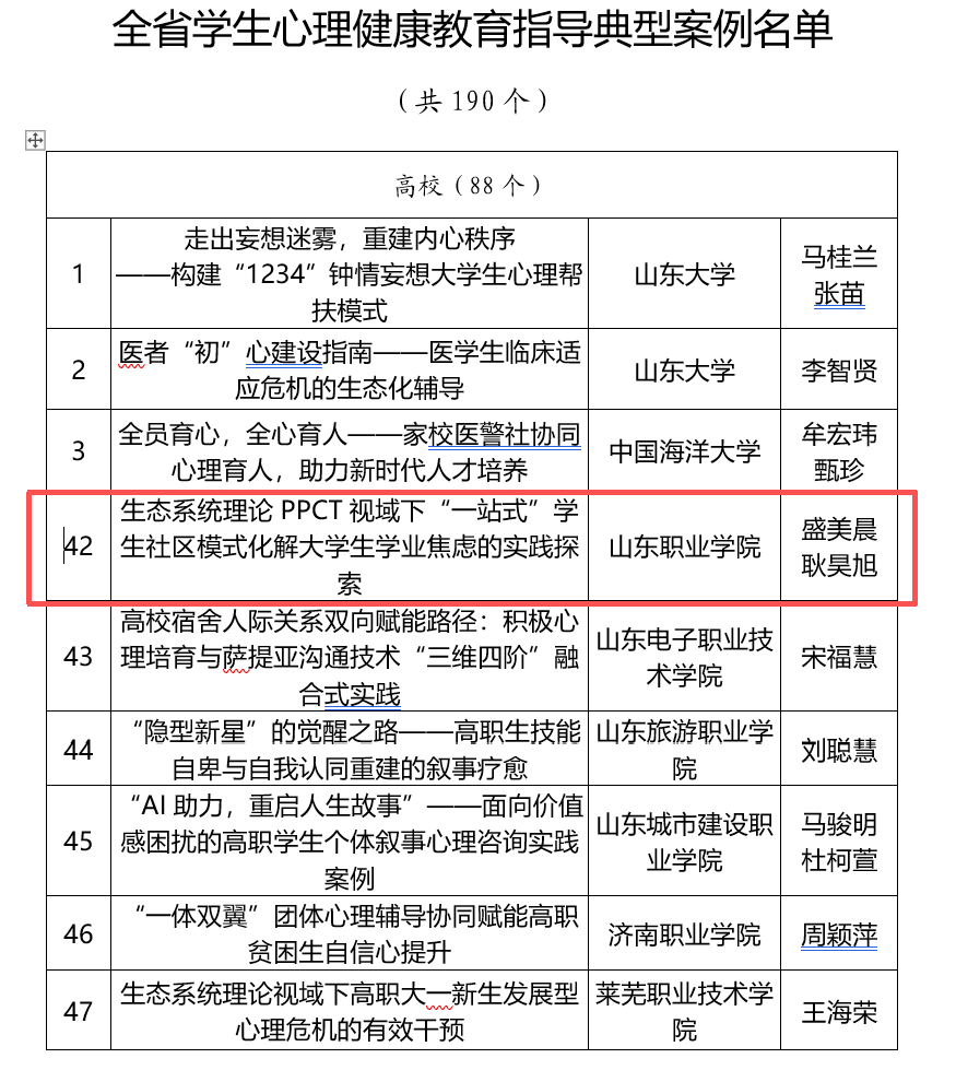 近日,山东省教育厅公布了“2025年山东省学生心理健康宣传教育月系列活动”评选结果,我校报送的心理健康教育案例《生态系统理论PPCT视域下“一站式”学生社区模式化解大学生学业焦虑的实践探索》入选“山东省学生心理健康教育指导典型案例”。