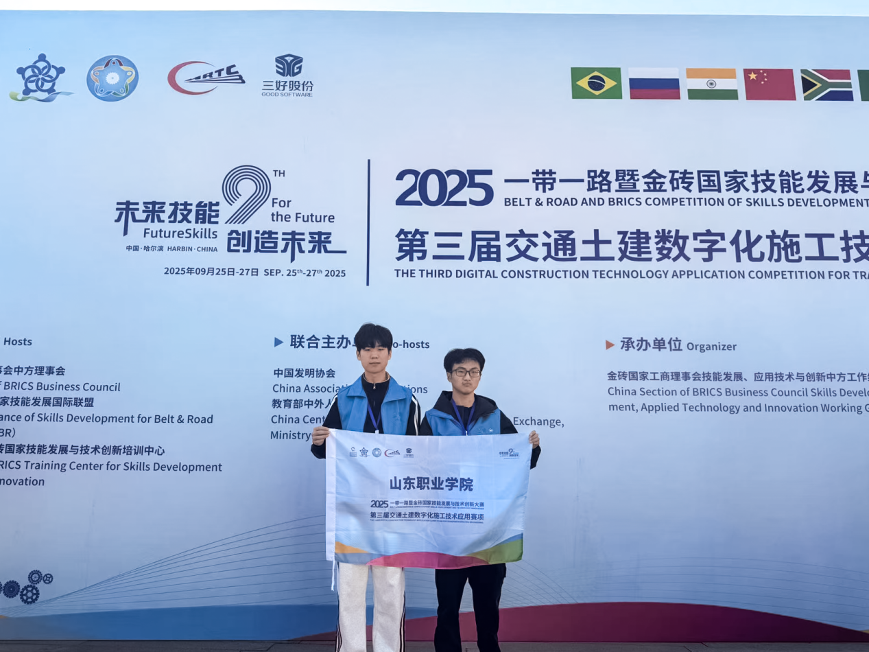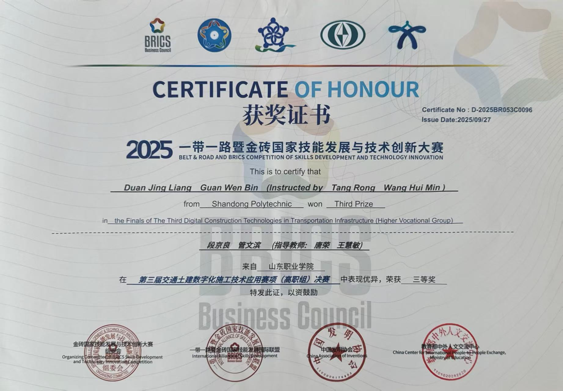 9月27日,2025“一带一路”暨金砖国家技能发展与技术创新大赛第三届交通土建数字化施工技术应用竞赛全国总决赛在哈尔滨铁道职业技术学院圆满闭幕。我校教师唐荣、王慧敏指导的段京良、管文滨荣获高职组全国总决赛三等奖。