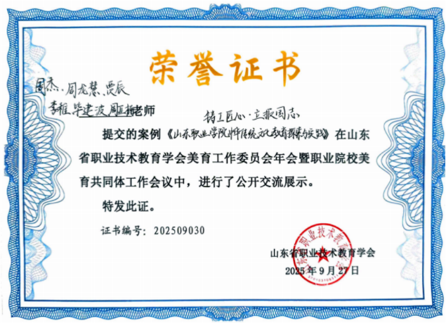 在山东省职业技术教育学会美育工作委员会年会暨职业院校美育共同体工作会议上,由周杰、毕建波、李稚、周龙慧、周亚楠、贾晨共同参与的《铸工匠心 立报国志——Beplay体育官方网站中华传统文化教育探索与实践》美育案例进行了公开交流展示,既将艺术技艺融入专业教学,也通过校园活动培育学生审美素养。
