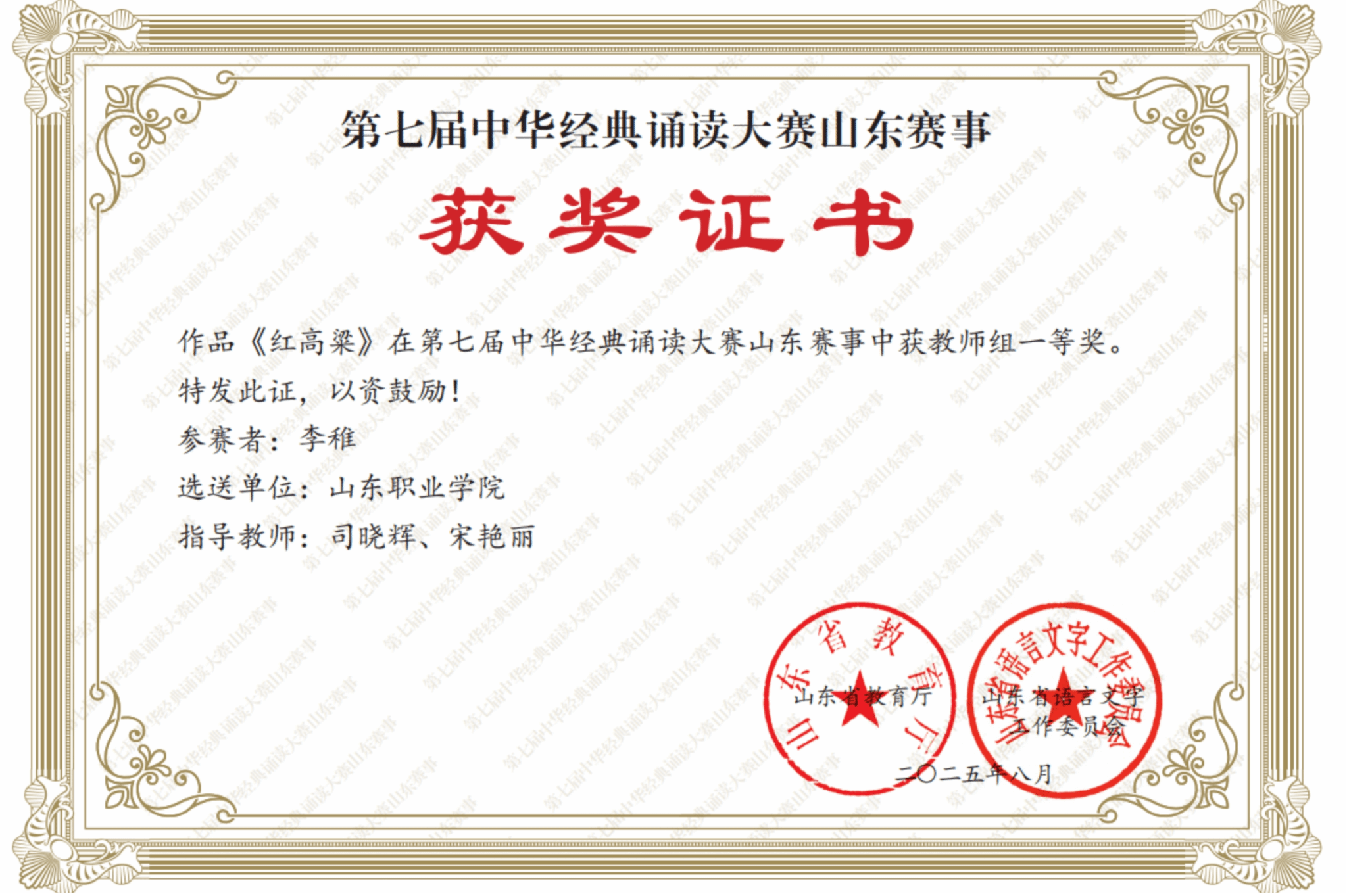 在第七届中华经典诵读大赛中,体育美育教学部教师李稚凭借作品《红高粱》,斩获全省教师组一等奖并顺利晋级国赛,实现了我校在该领域的突破。