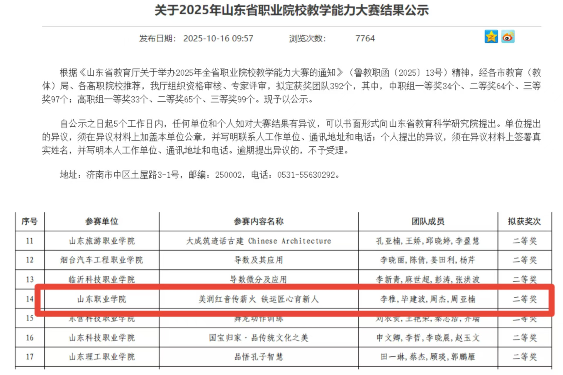 在2025年山东省职业院校教学能力大赛中,体育美育教学部毕建波、周杰、李稚、周亚楠团队凭借《美润红音传薪火 铁运匠心育新人》课程,荣获二等奖。团队紧扣“岗课赛证”育人理念,将虚拟仿真、AI互动等前沿技术融入教学设计,实现了专业内容与岗位需求精准对接、课程思政与技能培养深度融合。