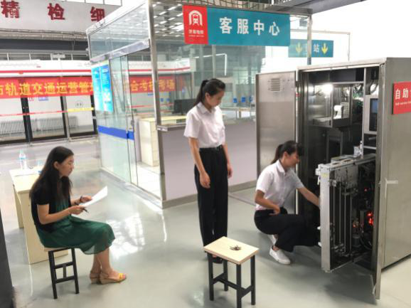 综合考核包括理论考核和实操考核两部分。理论考核涵盖三门专业课的综合知识考核,实操考核包括车站票务场景模拟、票务终端设备操作、站台服务、屏蔽门现场处置、手信号操作。
