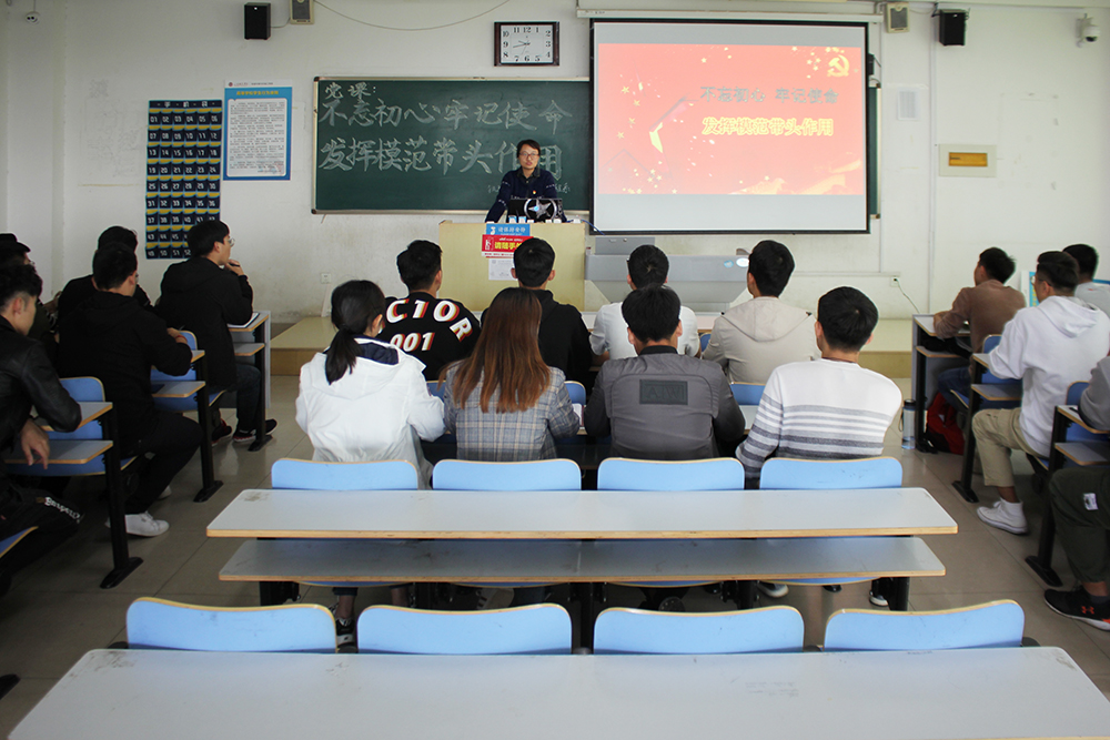 10月31日,铁道车辆与机械工程系学生党支部书记刘娟为入党积极分子讲“不忘初心、牢记使命”主题教育专题党课,系学工办主任殷岩锋、学生党支部教师党员王成琳等和2017级入党积极分子参加党课学习。
