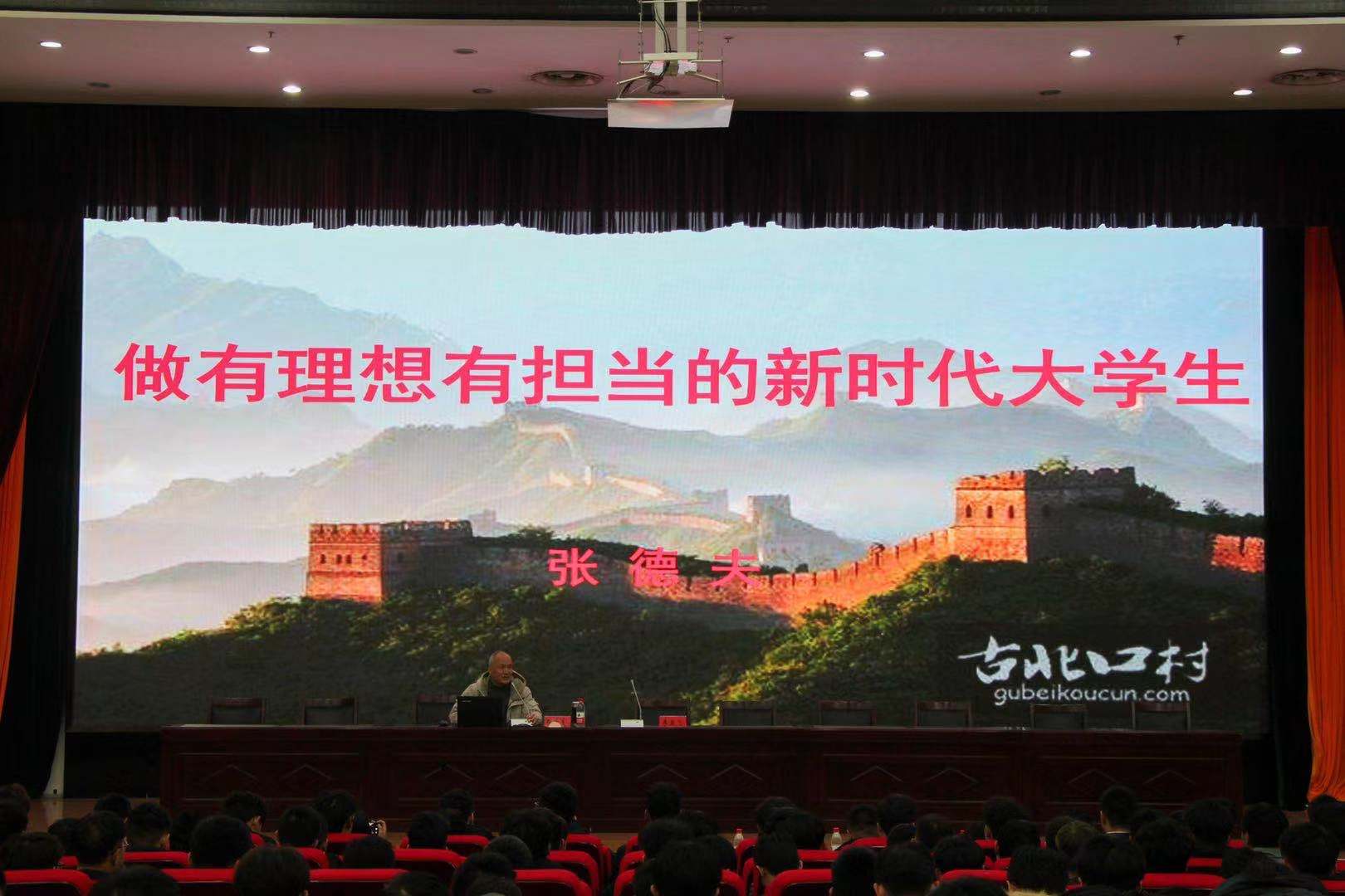 张德夫从“理想”“担当”两个方面入手,指出要想成为一名有理想信念的大学生,就要保持越是艰难越向前的刚健勇毅,并拥有能够为理想而奋斗一生的决心。民族振兴是新时代中国青年的责任担当,大学生群体应以高标准、严要求来衡量自己,将个人的发展融入到时代的潮流中去,从多方面完善自己、充实自己,为社会、为祖国的蓬勃发展而奋勇向前。