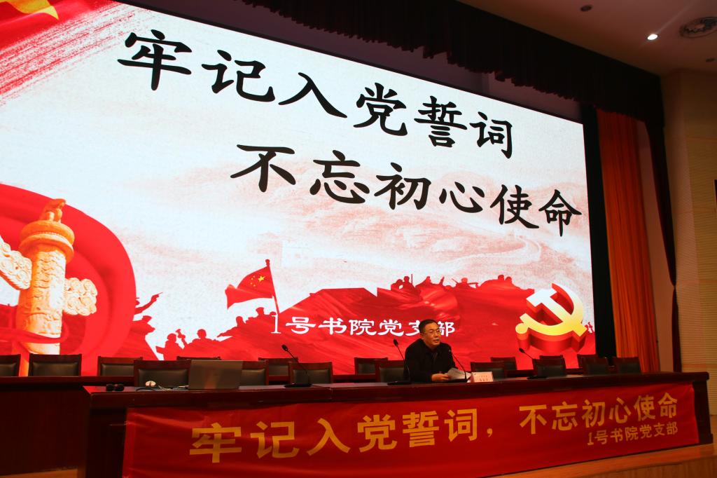 12月25日,书院党支部书记吕立宁讲授“牢记入党誓词 不忘初心使命”党课。吕立宁首先带领大家在庄严的国歌下重温了入党誓词,随后引用了习近平总书记的一句话告诫大家:“入党誓词字数不多,记住并不难,难的是终身坚守。每个党员要牢记入党誓词,经常加以对照,坚定不移,终生不渝。”全体党员要自觉用习近平新时代中国特色社会主义思想武装头脑,坚定为共产主义奋斗终身的信心和决心,牢记共产党员的政治责任和初心使命,永葆共产党员的政治本色。