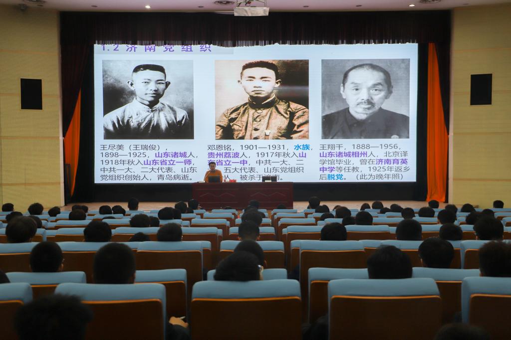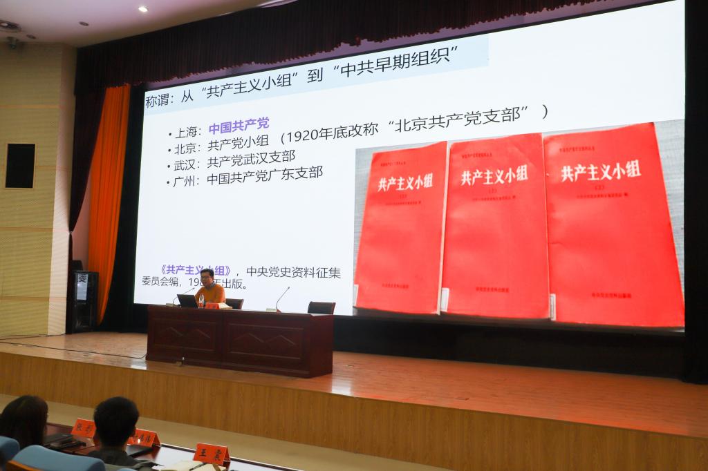 随后,王楠老师围绕深入学习贯彻习近平总书记在党史学习教育动员大会上的重要讲话精神和关于党史的重要论述,首先阐明了中央决定在全党开展党史学习教育的重大意义,指出要深刻把握习近平总书记在党史学习教育动员大会上的重要讲话精神。他从中共一大召开前的八个共产党早期组织分布及其成员事迹两个方面讲起,通过讲述早期共产党的建立以及用马克思主义来“改造中国和世界”的理想展现了中国共产党为人民、为国家的坚定信念以及艰苦奋斗的伟大精神。他表示,要通过对党史的学习,鼓舞我们的斗志,树立远大理想,在对党史不断学习的同时,坚定共产主义信念,不忘初心、牢记使命。