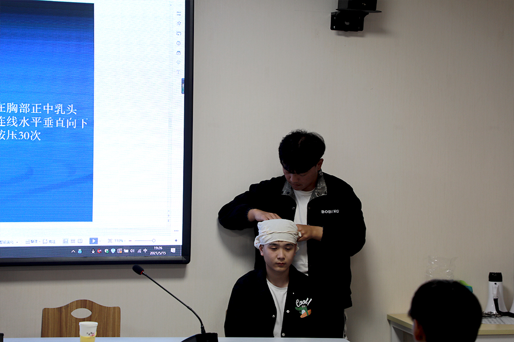 孙娜讲述了非医务人员学习心肺复苏的重要性以及生活中的急救知识,用模拟人为同学们演示了心肺复苏及人工呼吸的现场救助流程,详细介绍了检查、清理、抢救在内的各项措施和头部、腕部受伤的数种包扎方式。孙娜老师的讲解清晰明了、生动活泼,引发了同学们浓厚的兴趣。