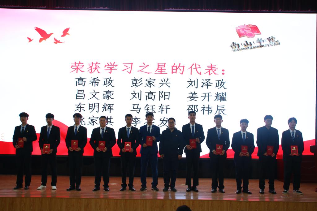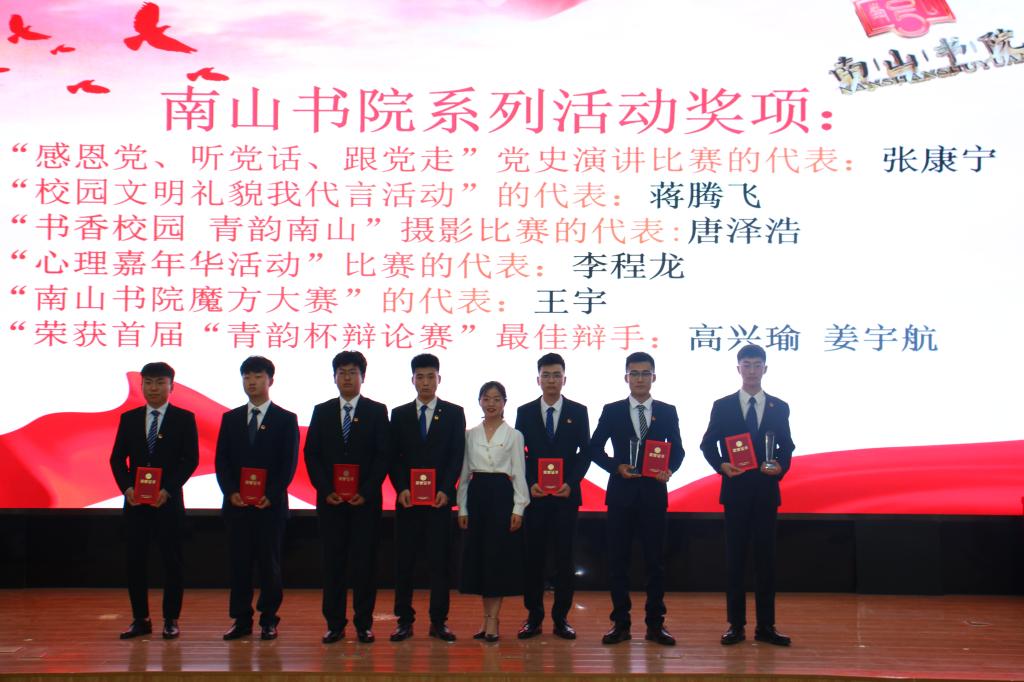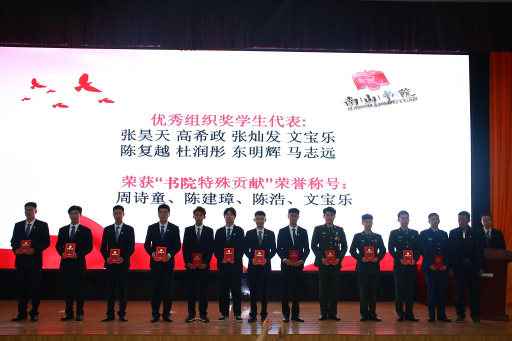 活动在嘹亮的国歌声中拉开帷幕,辅导员马茜宣读了南山书院表彰决定。对获得先进集体的5个书社、获得优秀宿舍的30个宿舍进行了表彰,授予高希政等958名同学“学习之星”称号、娄忠等237名同学“优秀学生”称号、俎志东等111名同学“优秀学生干部”称号、周诗童等30名同学“最佳贡献奖”、刘明豪等28名同学“南山杯”篮球赛“最佳活力奖”。