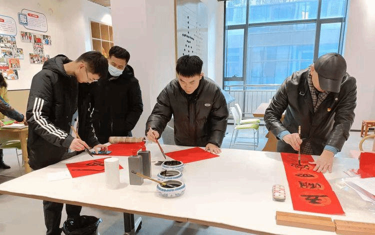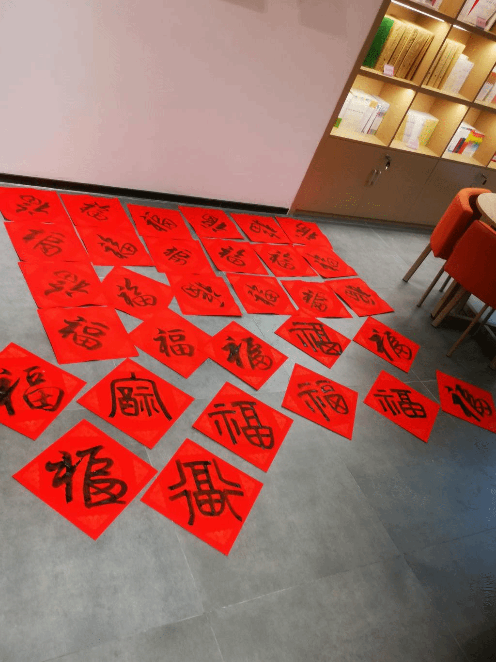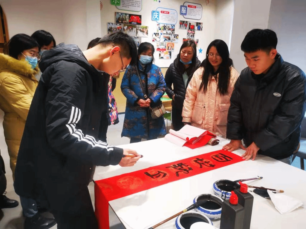 签约仪式后,学校学团党支部书记郭亭、部分书法协会学生与世贸天城社区书法爱好者共同为社区居民书写春联,送去暖心的祝福。活动现场,一副副寓意深远、吉祥喜庆的春联,铺满了社区党群服务中心。