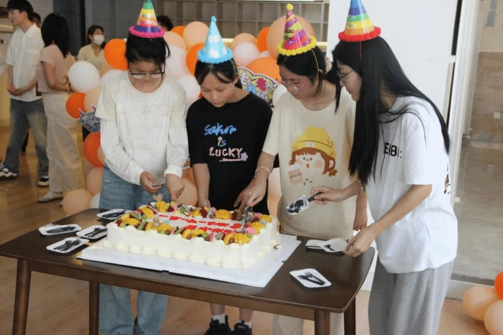 四位同学在众人的祝福声中共同切开了象征成长与希望的生日蛋糕,并许下了对未来的美好愿望,现场齐声共唱生日歌。