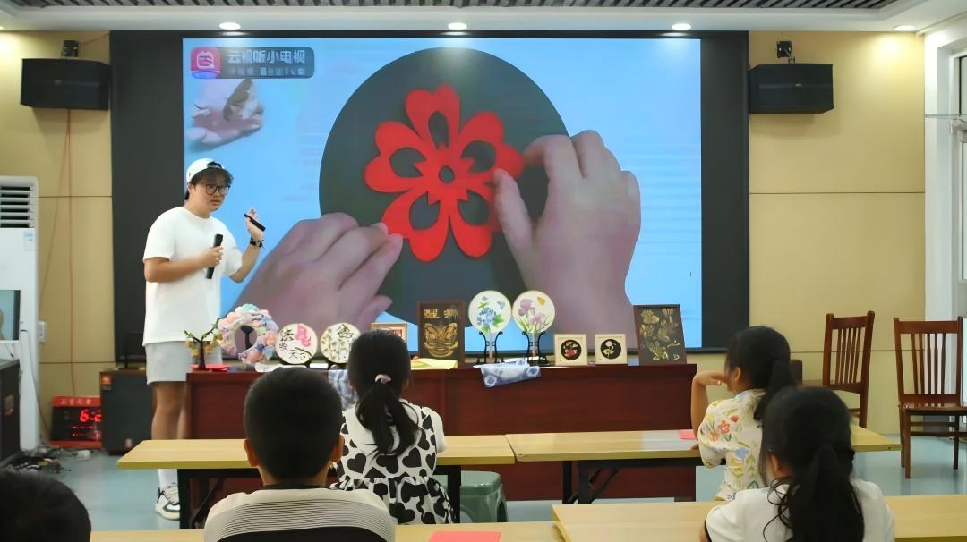 妙剪生花。团队成员以剪纸为媒,开启非遗启蒙。从基础团花技法教学到复杂纹样展示,队员们引导孩子们自己动手,在红纸翻飞间感受《龙凤呈祥》《花开富贵》等传统纹样的吉祥寓意。当精巧的窗花作品跃然指尖时,传统工艺的匠心之美悄然浸润童心,剪纸技艺也在儿童手中焕发新生机。