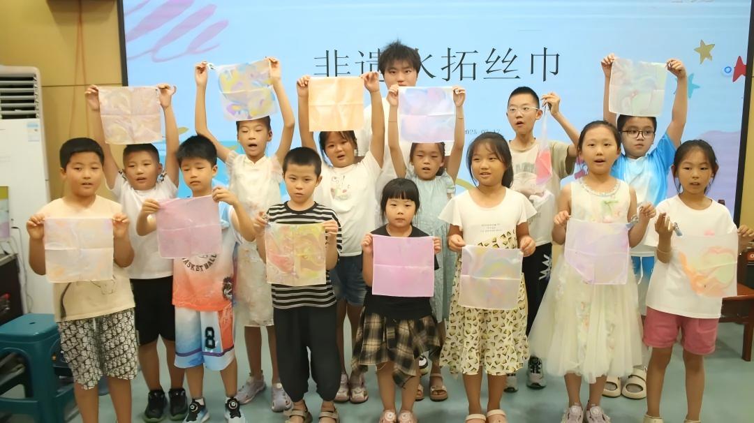 水拓成艺。在水拓画课堂,团队成员详细介绍了水拓画这一古老非遗技艺的历史渊源与独特魅力,让孩子们对水拓画技艺与现代丝巾工艺有了初步印象。队员们结合唐代“墨池浮纹”技艺源流,引导孩子滴彩入水、勾绘波纹。孩子们小心翼翼地将丝巾覆盖水面,轻提慢拉间,流动的水拓纹样便永久定格在丝织物上。丝巾轻覆水面刹那,流动的敦煌色系与青花纹样永久定格于方寸之间。孩子们高举丝巾欢呼:“我把银河披在身上!”非遗技艺在互动中完成从古法到潮品的蜕变。