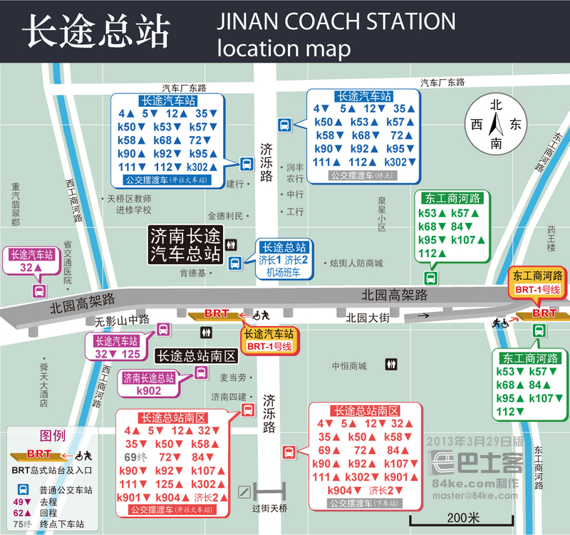 在站外济泺路路西的【长途汽车站】乘K68到【千佛山】下,原地换乘K301路到【埠东村】下。