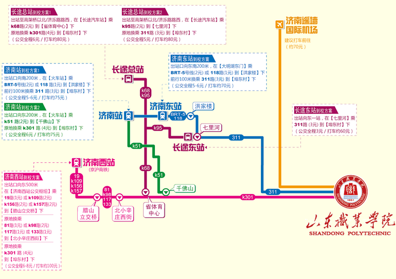 在出站口西南200米的【火车站】乘BRT_5号线到【洪家楼】下,前行150米换乘311路到【埠东村】下;或在火车站广场东200米车站东街的【火车站】乘K51到【千佛山】下,原地换乘K301路到【埠东村】下。特别提示:每年9月新生报到时间,学院有专车在火车站接送,敬请留意车站广场提示。