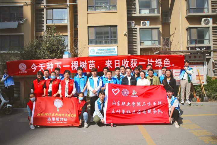 阳春三月,春意盎然。为更好弘扬雷锋精神,践行初心使命,在第45个植树节来临之际,3月11日,三味书院三叶草社区志愿服务队前往章丘区圣井街道北栗园村、孙村彩虹湖社区开展“为青山增绿 为党旗喝彩”义务植树活动,书院全体辅导员及部分学生志愿者参加活动。