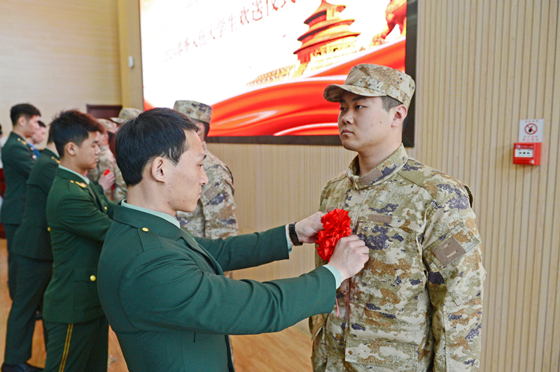 退伍学生为新入伍学生佩戴了光荣花。退伍学生代表马传海分享了军旅感受。