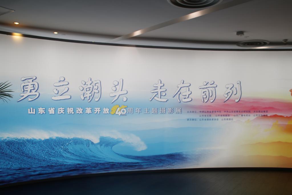 山东省庆祝改革开放40周年主题摄影展以“勇立潮头,走在前列”为主题,集中展示40年来特别是党的十八大以来我省改革开放的成就、经验。展览共精选420余幅图片,分“从严治党 不忘初心”、“聚焦生活点滴 记录社会进步”、“崇尚创新 砥砺奋进”、“注重协调 行稳致远”、“倡导绿色 岱青海蓝”、“厚植开放 拥抱世界”、“推动共享 成就梦想”7个部分,辅以多媒体、实物、图表等多种手段进行展示。