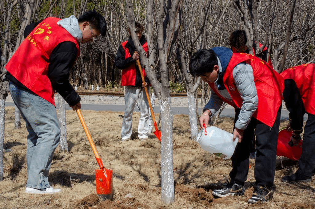 活动中,志愿者们松土、扶树、填土、浇水、回填,大家齐动手,互相配合、分工有序、有条不紊,确保栽一棵活一棵,植一片绿一方,植树现场呈现一派热火朝天的繁忙景象。志愿者们还对景区卫生进行打扫,用实际行动展现桐林学子昂扬的斗志与道德风尚。