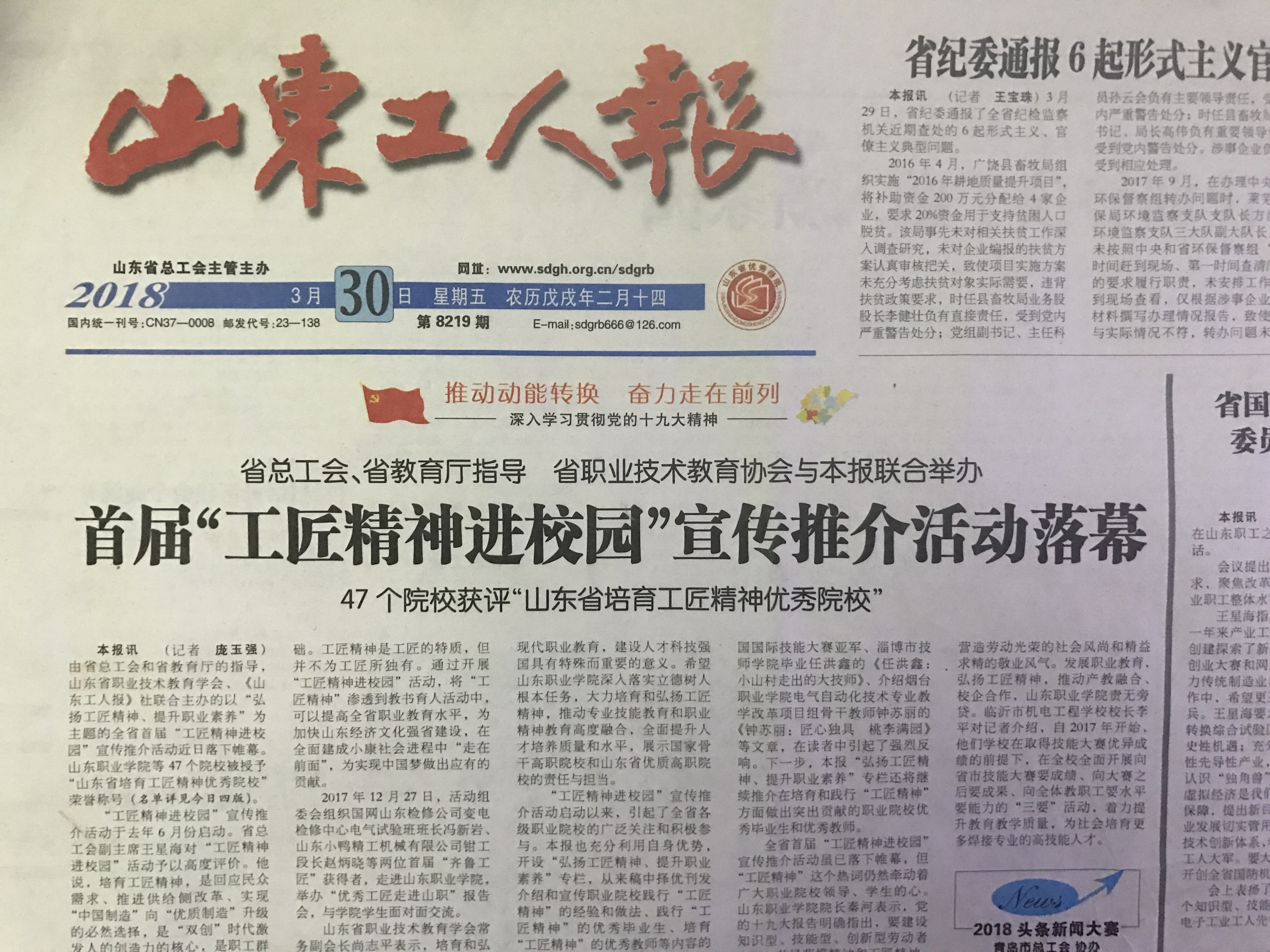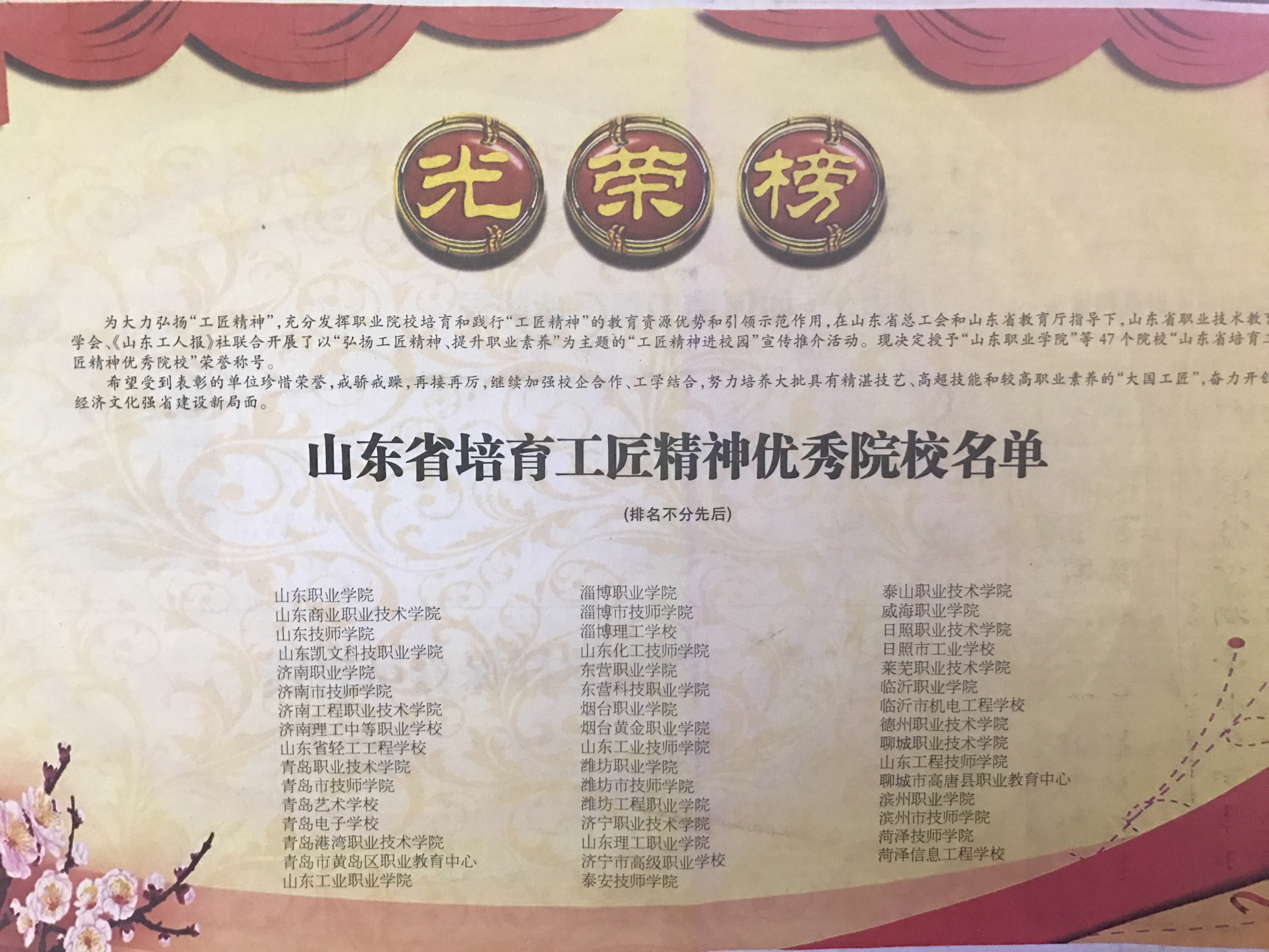 近日,由省总工会和省教育厅指导,山东省职业技术教育学会、《山东工人报》社联合主办的以“弘扬工匠精神、提升职业素养”为主题的全省首届“工匠精神进校园”宣传推介活动近日落下帷幕。我院等47个院校被授予“山东省培育工匠精神优秀院校”荣誉称号。