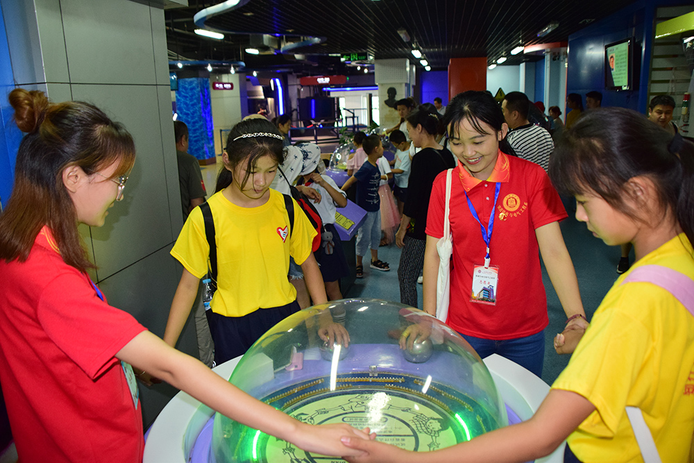 科技成果亲身体验,培养兴趣探索未知。社会实践队员携手小朋友走进山东省科技馆开展体验学习。山东省科技馆是我省传播普及科学知识的主要阵地,是立足阵地科普、流动科普、数字科普、资源建设“四位一体”的现代科技馆。同时,科技馆也为志愿者提供更多发挥专业优势的志愿服务岗位,让志愿者们学以致用,学用相长,坚持在周末、节假日等时间节点,开展志愿服务活动。克莱因瓶、弯曲的水流、无源之水、锥体上滚……琳琅满目的科技展品让孩子们迫不及待地投入到观察与探索当中,他们认真操作展品,仔细了解原理,深刻感受科技迅速发展给生活带来的巨大变化。为避免在人群中走失,队员们丝毫不懈怠,陪同孩子们一同参与到科技展当中。