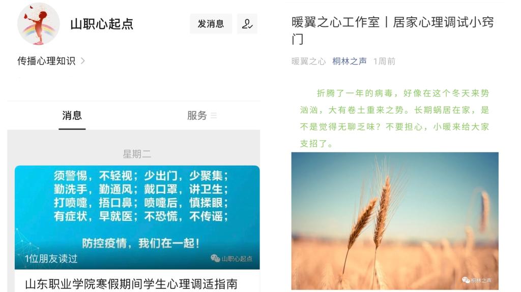 通过“山职心起点”“暖意之心工作室”等微信平台将《寒假期间学生心理调适指南》《居家心理调适小窍门》等推送到学生手中,帮助学生调节情绪、缓解压力。学生工作处、各书院老师,利用电话、QQ、微信等与学生特别是疫情中高风险地区的学生进行“一对一、点对点”在线交流,密切关注学生的思想动态,针对学生的具体情况做好心理援助帮扶,引导学生理性看待疫情,平和面对疫情,健康快乐地度过假期。