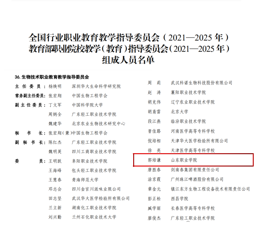 近日,教育部公布了全国行业职业教育教学指导委员会(2021—2025年)和教育部职业院校教学(教育)指导委员会(2021—2025年)组成人员,我校党委副书记郭培谦入选生物技术职业教育教学指导委员会委员,副院长郭鹏入选铁道职业教育教学指导委员会委员。