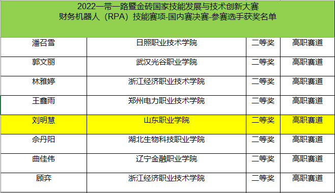 7月30日,由大数据与会计教研室主任刘春霞和李勉老师指导的学生参加了“2022一带一路暨金砖国家技能发展与技术创新大赛财务机器人(RPA)技能赛项”,共有来自全国400所院校、1100名选手参加决赛,经过激烈角逐,取得了二等奖1个、三等奖2个和优秀奖1个,学校荣获优秀组织奖。