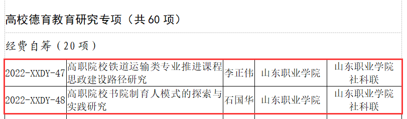 近日,山东省社科联公布了2022年度山东省人文社会科学课题立项名单。我校职业高等教育研究院石国华主持申报的“高职院校书院制育人模式的探索与实践研究”、铁道机车车辆学院李正伟主持申报的“高职院校铁道运输类专业推进课程思政建设路径研究”获批高校德育教育研究专项课题立项,实现了我校省人文社科课题申报工作的新突破。
