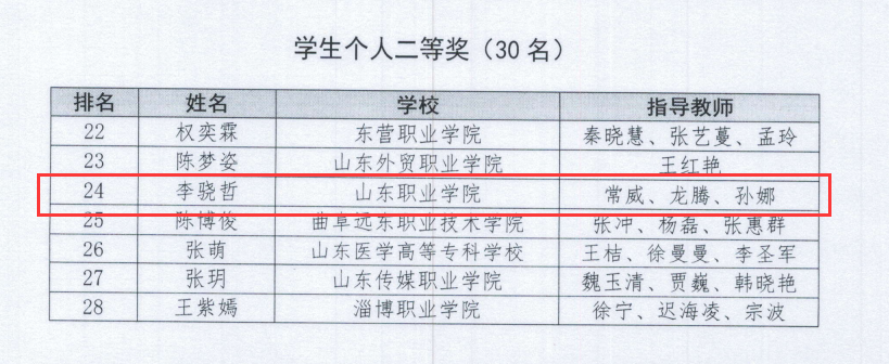 为做好比赛备战工作,学校积极部署,选派常威、龙腾、任斐等六名教师担任指导教师,对学生进行全方位指导。最终,龙腾、常威和任斐指导的黄炳乾获得一等奖;常威、龙腾和孙娜指导的李骁哲获得二等奖;常威、龙腾、卢颖立指导的高文哲、张梓豪获得三等奖。学校获得2022年山东省高职高专院校数字素养大赛优秀组织奖,常威获大赛先进工作者殊荣。