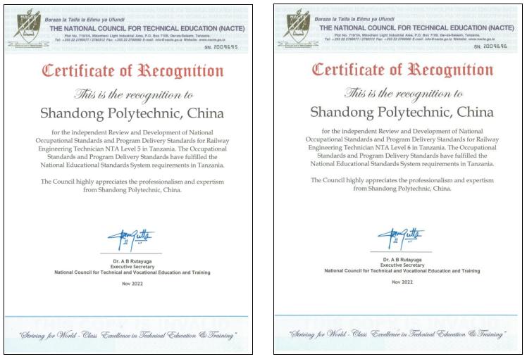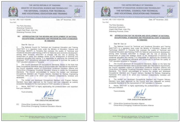 11月29日,由我校作为项目牵头单位开发完成的铁路工程技术员NTA5级和NTA6级、统筹四川建筑职业技术学院开发完成的NTA4级,共三套职业标准及专业教学标准顺利通过坦桑尼亚国家职业教育委员会审核,获得坦桑尼亚国家认证,正式纳入坦桑尼亚国家职业教育体系。这是我校首次为“一带一路”国家开发职业岗位标准,将先进的中国铁路技术推广至海外,提供中国方案,输出中国智慧。