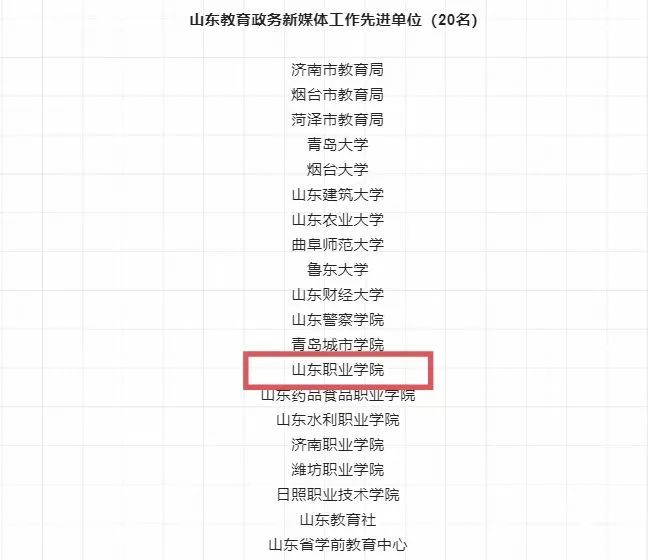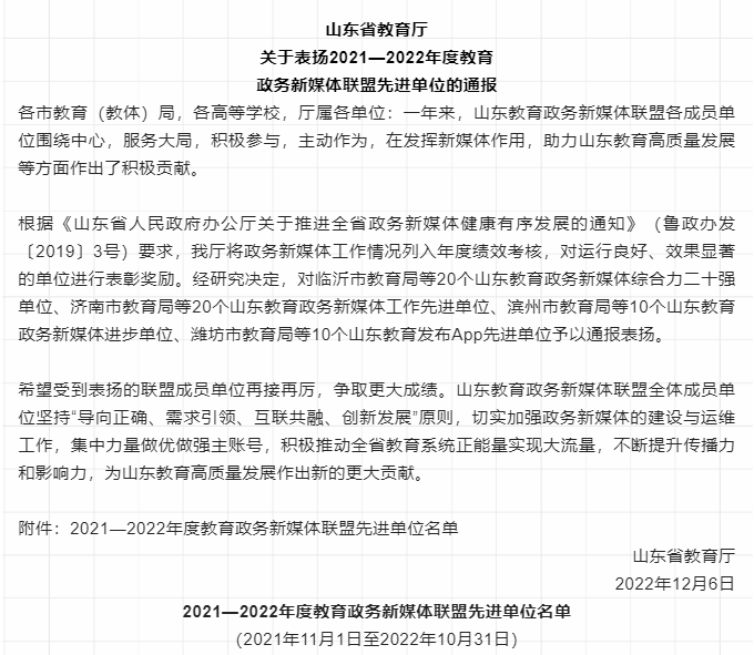 12月7日,山东省教育厅发布《山东省教育厅关于表扬2021-2022年度教育政务新媒体联盟先进单位的通报》,我校荣获“山东教育政务新媒体工作先进单位”荣誉称号。自2017年山东教育政务新媒体联盟成立以来,我校已连续五年获此殊荣。