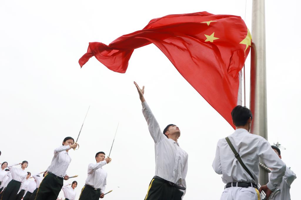 伴随激昂的军乐曲,一排排整齐的方队迎面走来,他们军姿严整、步伐雄健、士气高昂,展现了新时代军人和新时代大学生的朝气与风采。