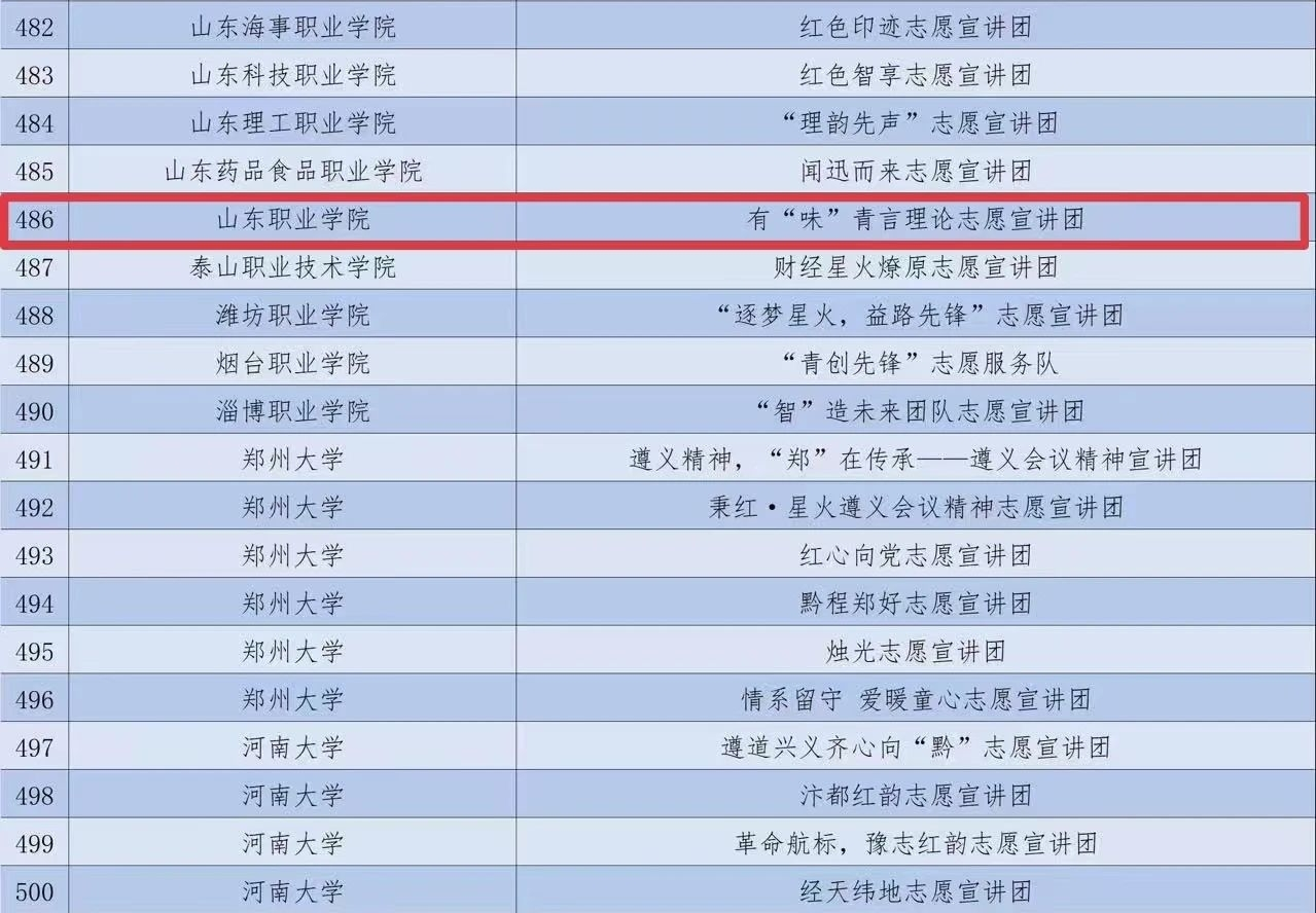 11月6日,团中央青年志愿者行动指导中心联合有关单位发布了《2024年全国大学生遵义会议精神志愿宣讲团入选团队名单》《2024年全国大学生沂蒙精神志愿宣讲团入选团队名单》,我校三味书院有“味”青言理论志愿宣讲团入选2024年全国大学生遵义会议精神志愿宣讲团,东岭书院“沂”心向党志愿宣讲团、天佑书院薪火青春志愿宣讲团入选2024年全国大学生沂蒙精神志愿宣讲团。
