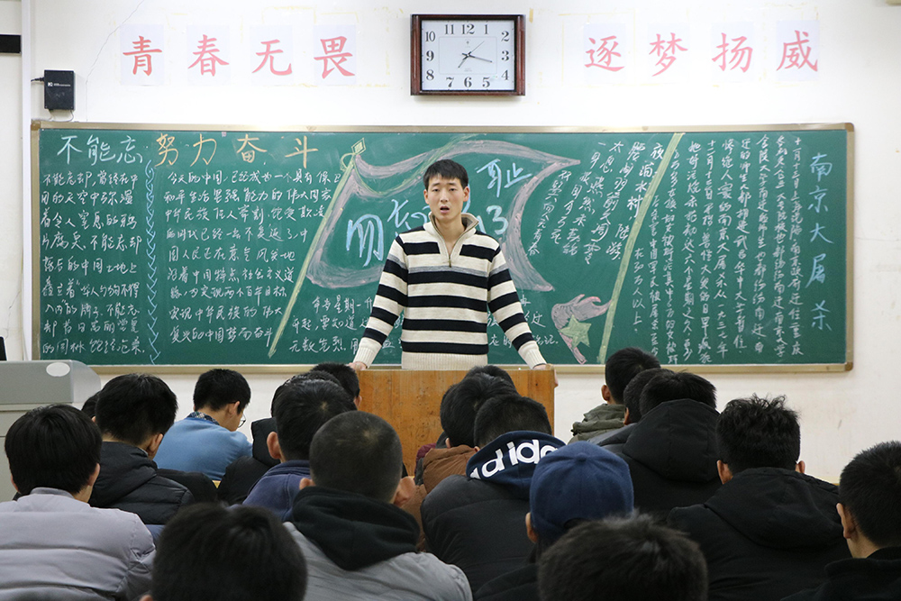 班会上,各班班长、团支书组织同学们观看南京大屠杀纪录片,缅怀所有惨遭日本侵略者杀戮的死难者同胞,缅怀为中国人民抗日战争胜利献出生命的革命先烈和民族英雄,引导大家勿忘国耻,矢志前行。