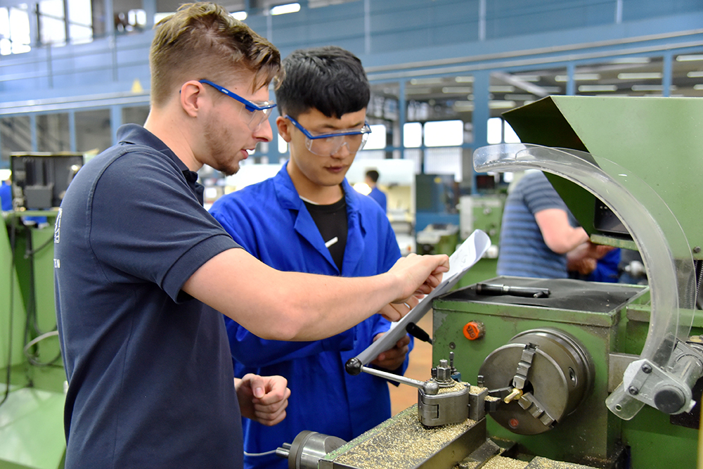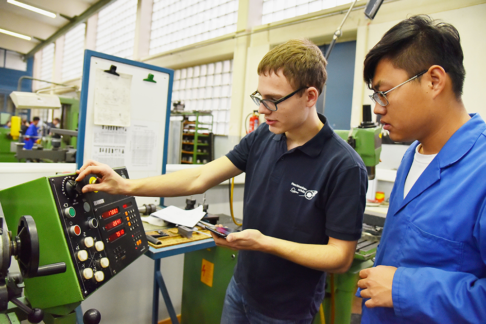 项目开始的第一周为适应性学习和操作。学院2位教师和6名学生在德方师生的帮助下,熟悉掌握德方机器设备的性能和使用方法,同时中德双方学生一对一组成小组,加强交流磨合。经过一周的训练提升,双方学生越来越熟悉,默契度逐渐上升,一个小小的手势或表情,彼此就会明白对方意思。