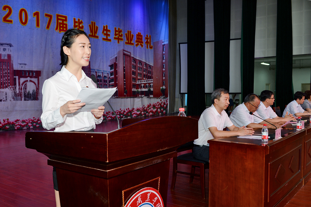 “我们将以毕业为新的起点,秉承‘知能共进,德道同优’校训精神,在各自的工作岗位上勤于实践、踏实做事,在事业轨迹上继续镌刻着我们忠诚、求实、勤奋、创新的坚实足印,为母校增光添彩,为祖国建设添砖加瓦。”