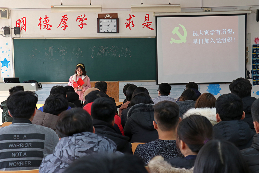 张娜从我国宪法的地位、产生、发展、修改、作用意义等方面进行了系统讲解。她强调,宪法作为国家的根本大法,是治国安邦的总章程,入党积极分子们应该增强宪法意识,自觉维护宪法权威,弘扬宪法精神。张娜为大家普及了宪法宣誓制度,带领入党积极分子们认真解读了《中华人民共和国宪法》读本,着重强调了宪法历程与宪法内容。期间,大家还观看了宪法宣传片。张娜强调,入党积极分子应该深刻认识到宪法修改的重要意义,准确领会和把握宪法修正案的核心要义和实质。